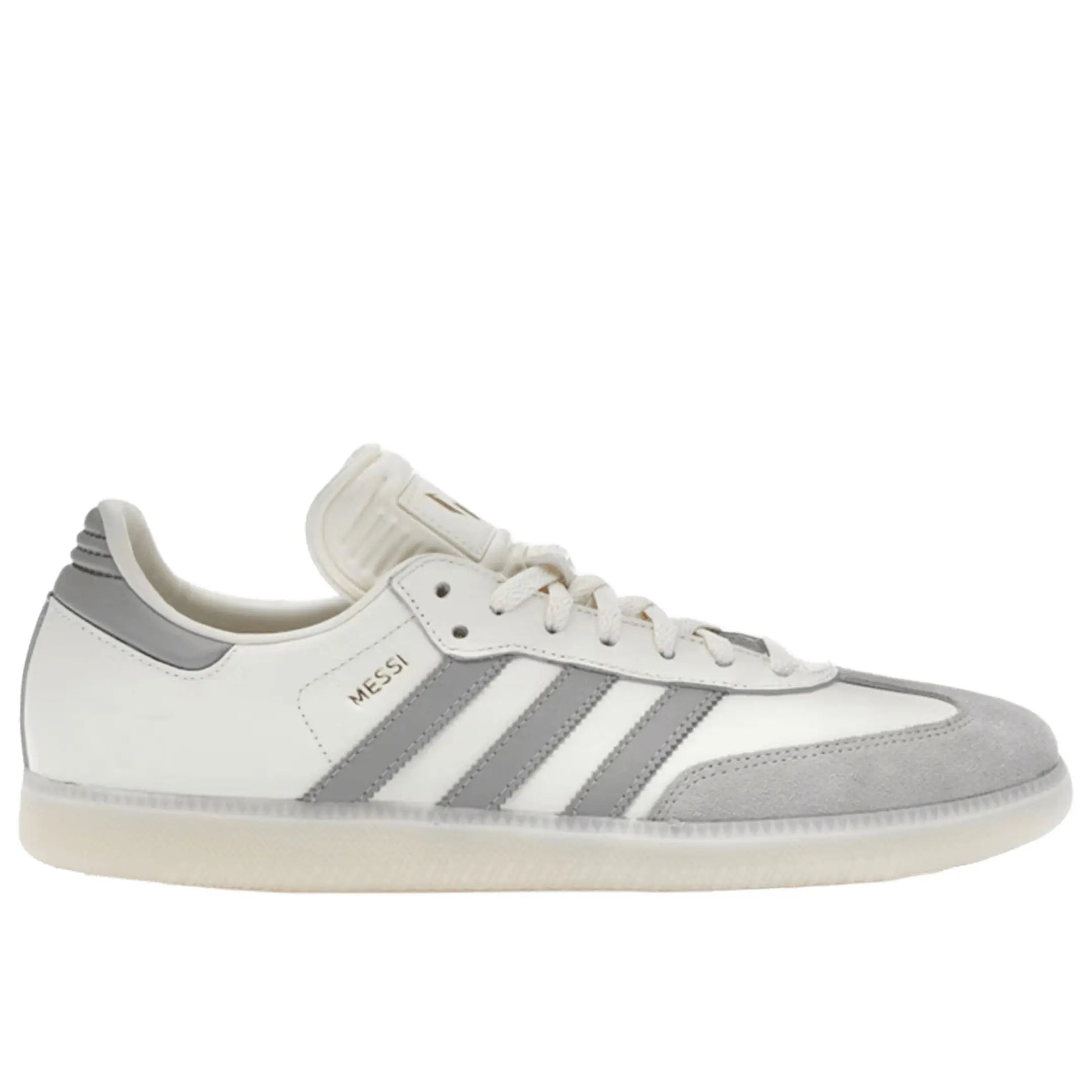 A refined edition honoring Lionel Messi, this Samba reinterprets the classic silhouette with elegance. The upper is crafted in premium cream leather, contrasted by light brown suede overlays at the toe and heel. Subtle grey Three-Stripes and heel tab provide cool contrast, while metallic gold accents—featuring Messi’s signature “M” on the tongue and heel—add a luxe, personal touch. The gum rubber outsole retains the Samba’s heritage grip and aesthetic. Released in early 2025 with a retail price around $100, this model masterfully blends minimalist sophistication with football legend appeal.