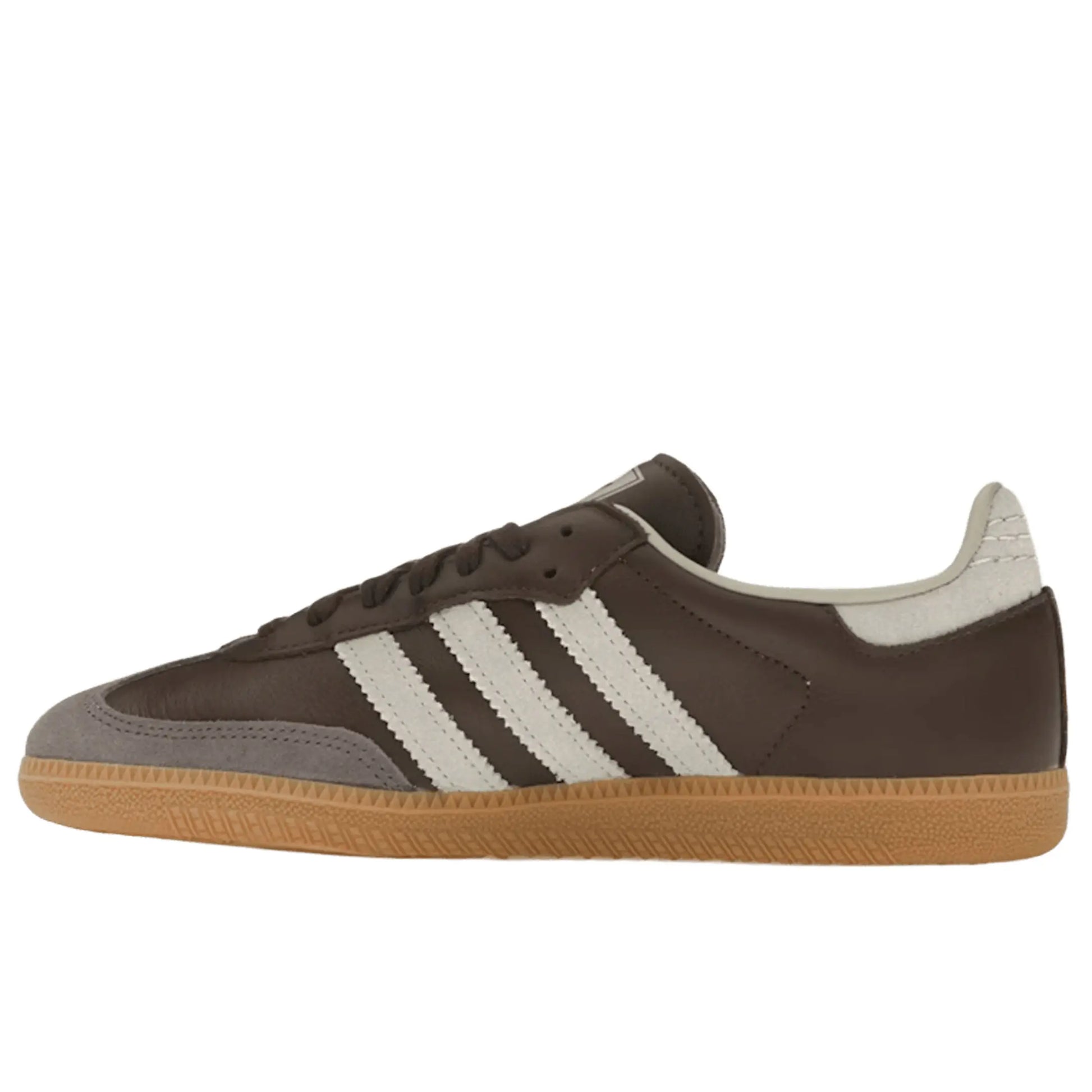 The adidas Samba OG returns in a sophisticated Brown and Putty Grey colorway with gold metallic detailing. Crafted with a premium brown leather base and a grey suede T-toe overlay, the design is finished with contrasting off-white accents on the Three Stripes and heel tab. Gold-foil “SAMBA” branding adds a touch of heritage luxury, while the gum rubber outsole ensures durability and that timeless retro appeal. Released in September 2024, this edition blends classic sport-inspired roots with elevated everyday style.