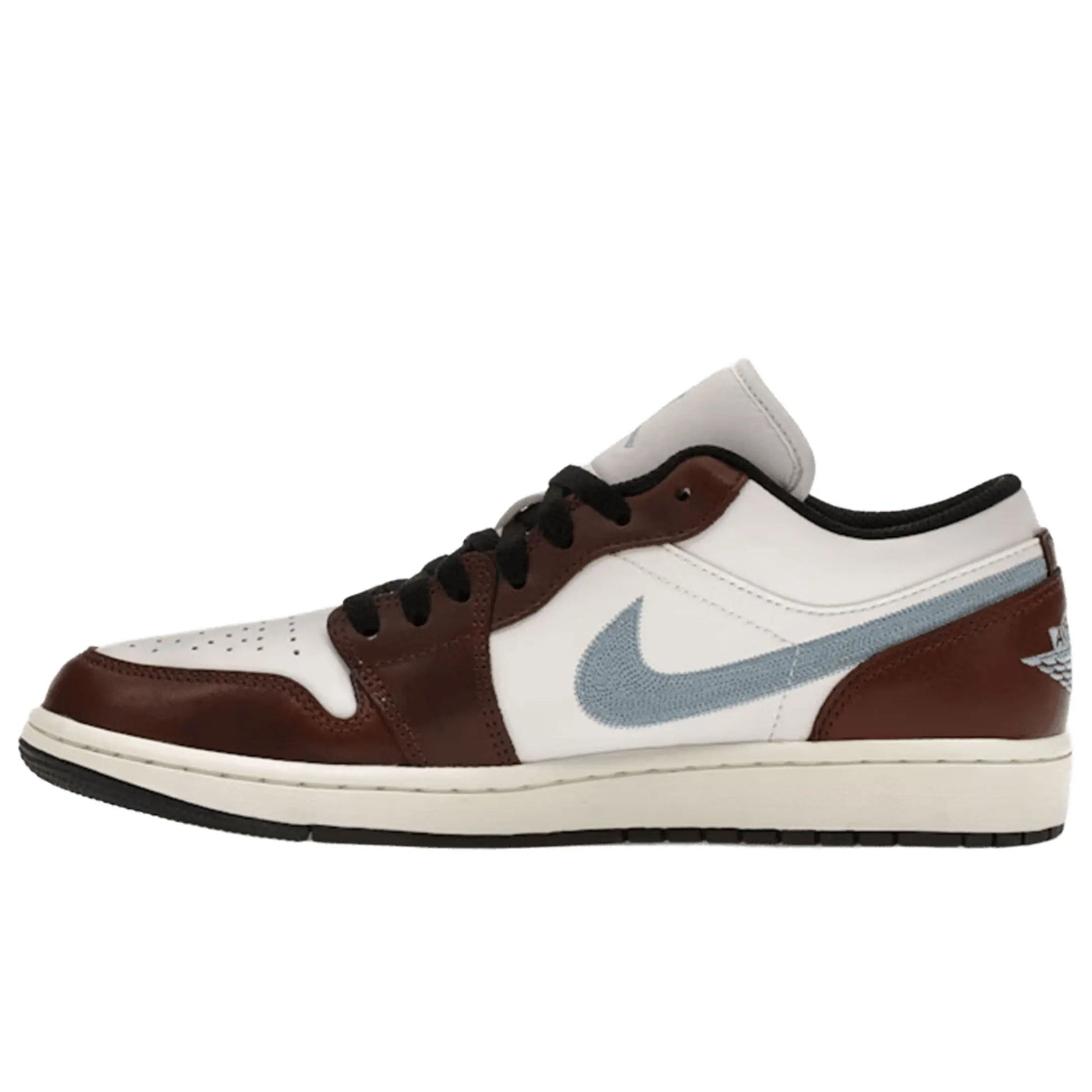 The Air Jordan 1 Retro Low SE 'Brown Blue Grey' carries a smooth leather upper, featuring a white base with contrasting brown overlays at the forefoot and heel. The latter is marked with a Wings logo in steel blue embroidery, matching the signature Swoosh and the Jumpman icon atop the tongue. A vintage off-white rubber midsole packs an Air-sole heel unit encapsulated in a lightweight polyurethane wedge.